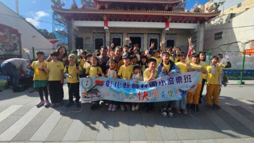 小朋友來到三峽老街進行「快閃音樂會」